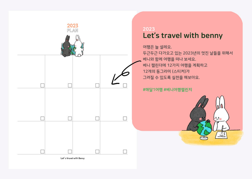 탁상 달력 속 2023 PLAN에는 평소에 꼭 가고 싶었던 그 곳! 베니와 함께 상상하며 적어 보세요. 혹은 여행지가 생각나지 않는다면 꼭 하고 싶었던 일을 계획하는 것도 아주 훌륭해요! 혼자라면 계획하기가 쉽지 않지만 함께라면 좀 더 쉽겠죠? 베니와 함께 여행 계획을 세우고 같이 이야기를 나눠요! 꼭!