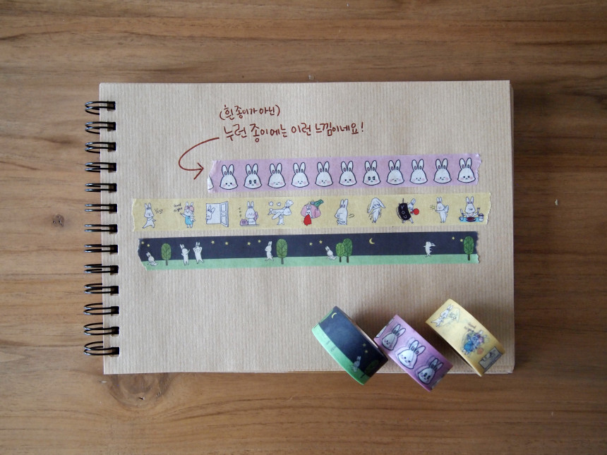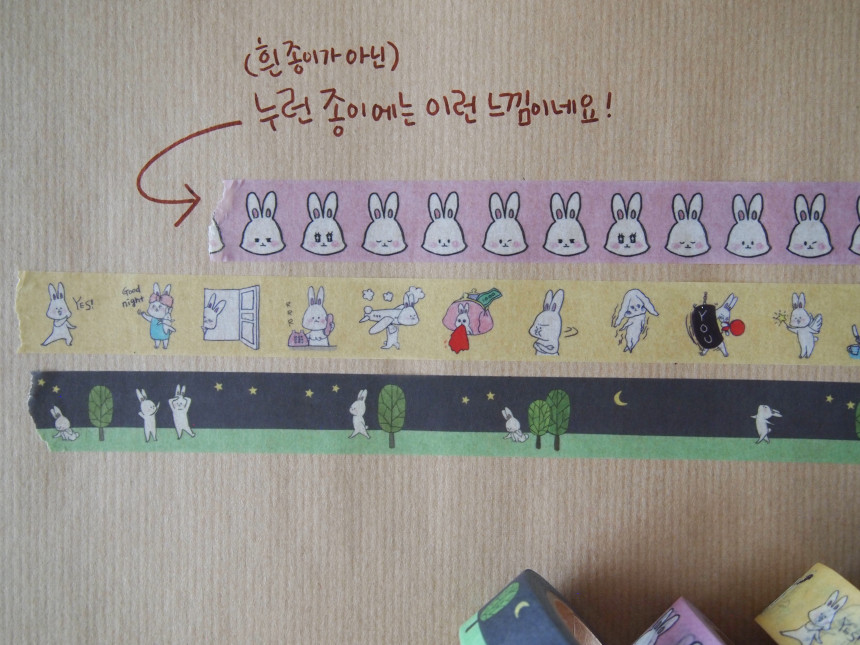 마스킹테이프가 붙여지는 부분에 따라서 컬러가 다르게 보일 수 있습니다. 누런 종이에 테이프를 붙였더니 위의 느낌이 나더라고요. 사용하실 때 참고하시면 될 것 같습니다^^